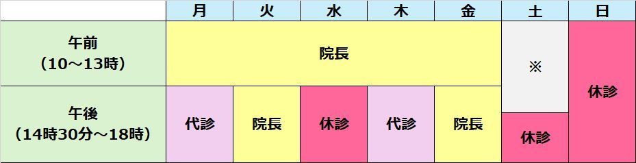 | 午後 | 代診 | 院長 | 休診 | 代診 | 院長 | ||